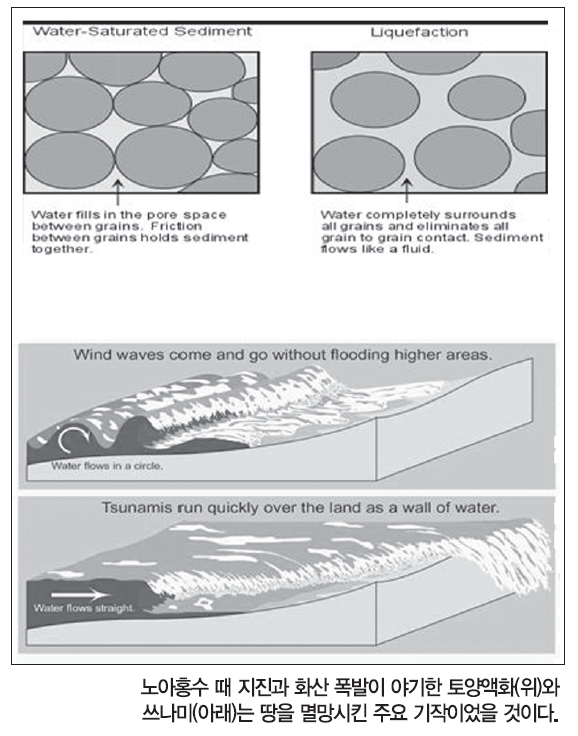 최근에 사람들이 기록한 홍수들, 화산들, 지진들은 분명히 생명과 땅을 유린한다. 하지만 하나님이 만드셨던 완전한 원래의 지구를 파괴했던 전세계적인 대격변에 비하면 아주 작은 것이다. 방주에 타지 않았던 사람들과 모든 동물들은 홍수의 물에 멸망되었다. 그 수 십억의 동물들이 우리가 보고 있는 대화석 기록으로 보존되어 있다. 그 사람들은 한 번도 비를 경험해 보지 않았고 홍수가 있을 것이라는 것도 상상하기 어려웠을 것이다. 어디서 그렇게 많은 물이 나올 수 있었을까? 성경은 그 물이 땅 밑과 땅 위 두 곳에서 나왔다고 말하고 있다: 땅 아래 물 근원은 지하의 거대한 저수지나 민물 샘들이었는데 화산이나 지진 활동에 의해 열렸음에 틀림없다. 이런 샘들이 에덴 동산의 강을 만들었고 홍수 이전의 지구에 물을 공급하였을 것이다.