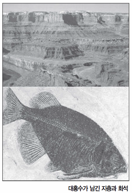 바다 밑에서부터 산 꼭대기까지, 세상 어디를 가든지 이 땅에 남겨진 노아 홍수의 증거들을 볼 수 있다. 차나 기차로 혹은 비행기로 여행하든지, 캐년이나 분회구, 석탄층, 수 많은 동굴 등, 물리적인 지구의 지형 형태들에서 분명한 격변적 과거를 발견할 수 있다. 대략 75%의 지구 표면(지각)은 퇴적암으로 되어있다. 모래나 흙 혹은 다른 물질로 된 퇴적충들은 대부분물에 의해서 쌓이게 되었는데 한 때는 진흙처럼 부드러웠지만 이제는 돌처럼 굳어졌다. 이 퇴적 충에 뭍혀 화석이 된 수 십억의 동식물들은 정말 순식간에 매몰되어 죽게 된 것들이다.