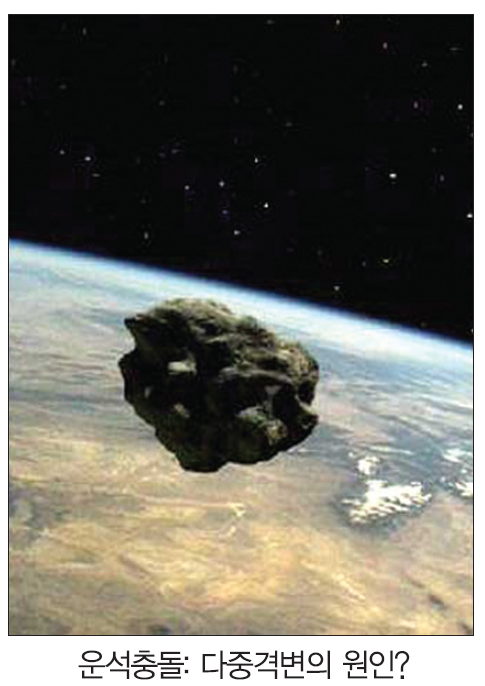 ‘창조와 격변’ 제 14장 ‘대홍수와 다중격변’ 내용 중 대홍수론에 대한 비판에서 저자는 성경의 기록으로는 전지구적인 홍수의 증거가 압도적이지만, 지질학적인 면에서는 국부홍수론의 주장이 만만치 않으며, 방사성 연대측정법이 재현 가능하고 신뢰할 수 있는 방법이기 때문에, 다중격변모델이 성경적 해석과 지질학적 해석의 딜레마를 가장 잘 해결할 수 있는 모델이라고 주장하고 있습니다. 다중격변모델의 가장 분명한 증거로는 지구 곳곳에서 발견된 크고 작은 운석공들이며, 지구상에 확인된 171개의 운석공들 중 지구에 엄청난 재앙을 가져다 줄 수 있는 직경 2km이상 인 것들은 140여 개에 이르는데, 지난 4000년의 인류 역사에는 이런 흔적이 없기 때문에, 인류 역사 이전에 장구한 기간에 걸쳐서 운석충돌들이 일어났을 것으로 기술하고 있습니다. 운석충돌과 동시에 일어난 화산폭발이 격변을 가능하게 했고, 노아 시대 대홍수는 마지막 격변으로 신생대 홍적세 지층을 만든 홍수였을 것으로 주장하고 있습니다. 이러한 주장에 대하여 한국창조과학회는 동의할 수 없습니다.