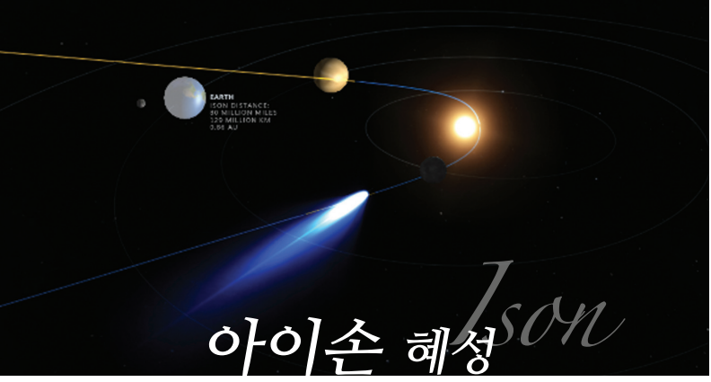 지난 해 9월에 발견된 금세기 최고라고 알려진 혜성 이름이다. 이 아이손(ISON) 혜성은 11월 29일 드디어 태양에 가장 가까이 접근하고 마침내 반환점(근지점)을 돌아 태양으로 부터 멀리 사라지게 된다. 따라서 지구 상에서 가장 관측하기 좋은 시기는 지난 11월 19일 이었고 다음 기회는 태양을 돌아 나오는 12월이 된다. 맑은 밤 하늘이라면 육안으로도 선명하게 볼 수 있기 때문에 모두 크게 기대를 모으고 있다.